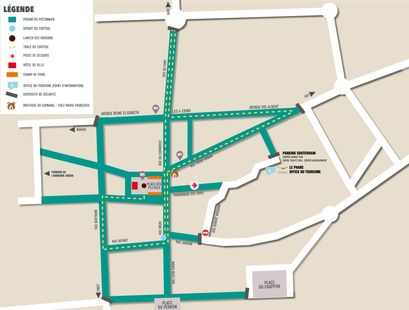- Le centre-ville est piétonnier pendant l’événement. Des infrastructures de sécurité fermeront le site aux véhicules. Respectez également les mesures de stationnement qui permettent au cortège de circuler sans encombre.